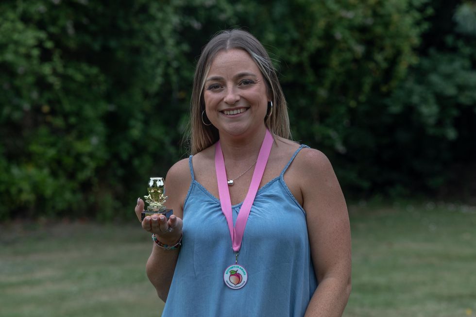 An Essex mum who became a viral hit after tripping and mooning the crowd during a parents' sports day race has been given a trophy – shaped like her bum.