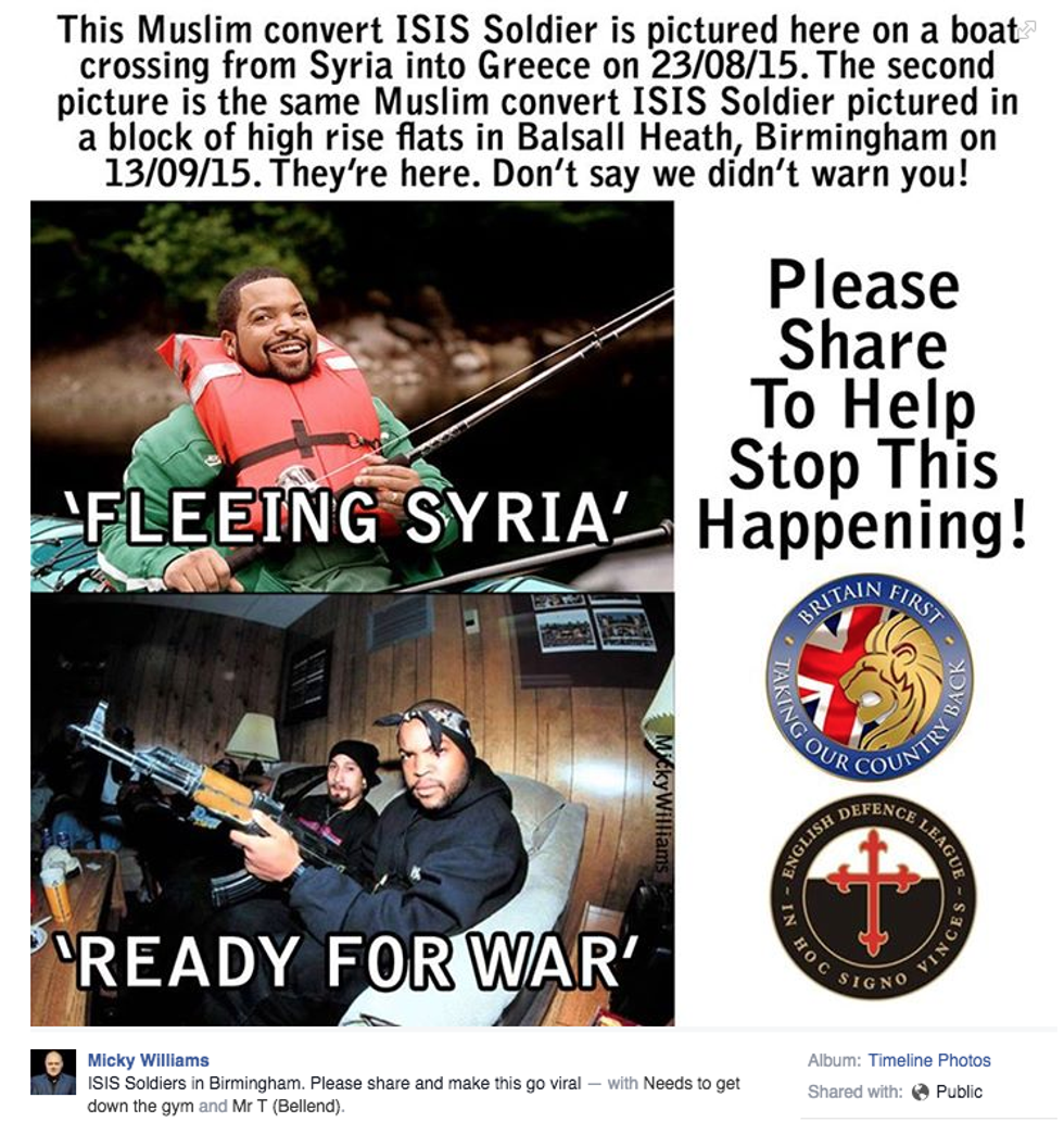 Mocking the usual scare tactics used on these sort of posters, Williams' caption reads: "This Muslim convert ISIS Soldier is pictured here on a boat crossing from Syria into Greece on 23/08/15. The second picture is the same Muslim convert ISIS Soldier pictured in a block of high rise flats in Balsall Heath, Birmingham on 13/09/15. They're here. Don't say we didn't warn you!"