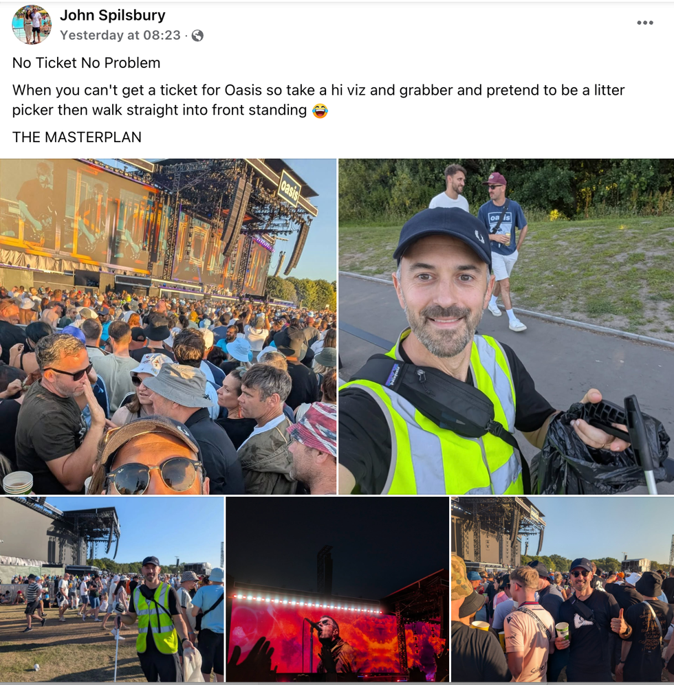 "No Ticket No Problem When you can't get a ticket for Oasis so take a hi viz and grabber and pretend to be a litter picker then walk straight into front standing", he wrote, before adding: "The Masterplan".