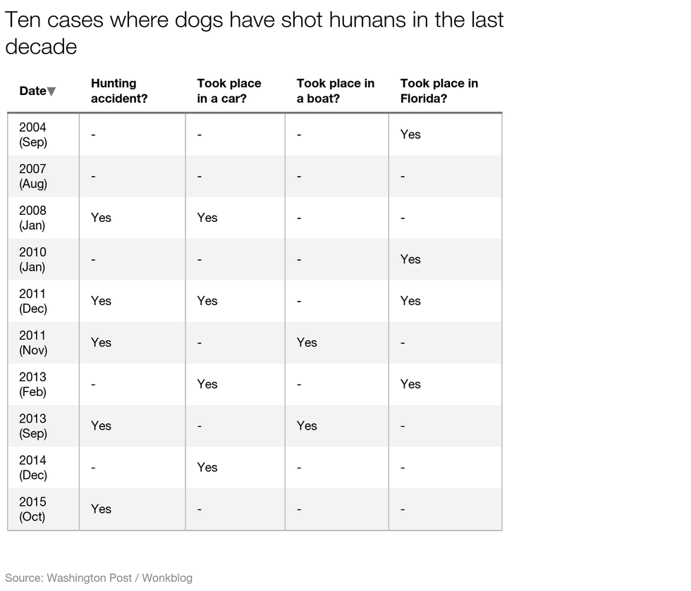 When you have a country with as many people, guns and dogs as we do, this type of thing is going to happen from time to time. It does happen elsewhere too. For instance, a French hunter had to have his hand amputated in 2012 after his dog jumped on him, setting off his shotgun. A New Zealand man was shot by his dog in 2010. These international cases aren't included in the table above.