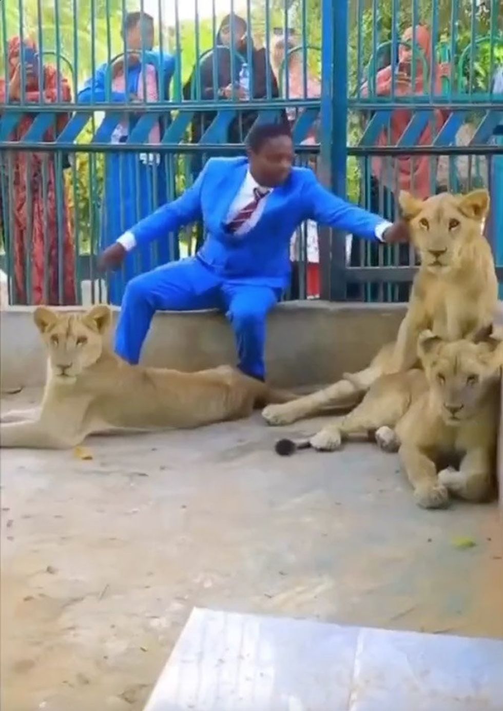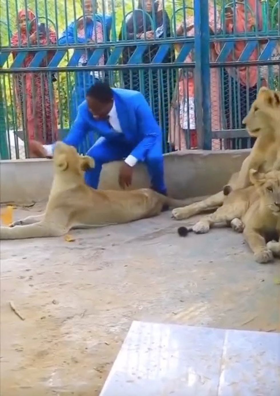 The clip shows the pastor, seen wearing a bright blue suit, stroking the growling lions in their enclosure in Nigeria.