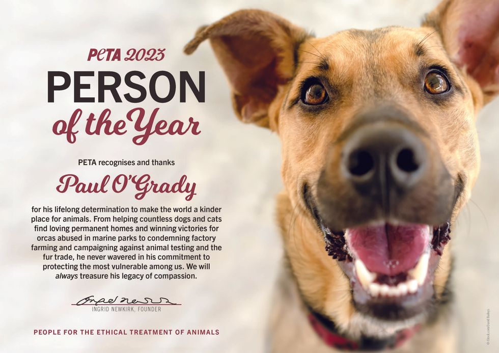 Paul O’Grady has been posthumously named Peta’s person of the year for his “lifelong determination to make the world a kinder place for animals”.