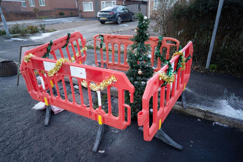 Now a mystery resident has decided to poke fun at the situation by decorating the barriers with tinsel and placing a Christmas tree inside.
