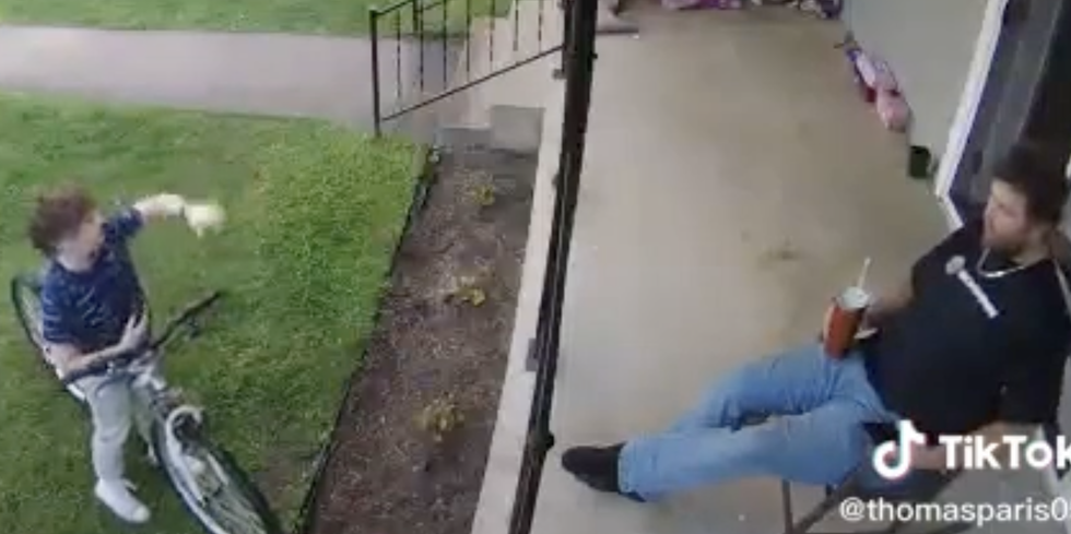 In the video, a boy appears to ride up on his bicycle to the TikToker’s front porch and notices a flag hanging up. It also seems that he's asking the man something, but the rain drowns out the sound.