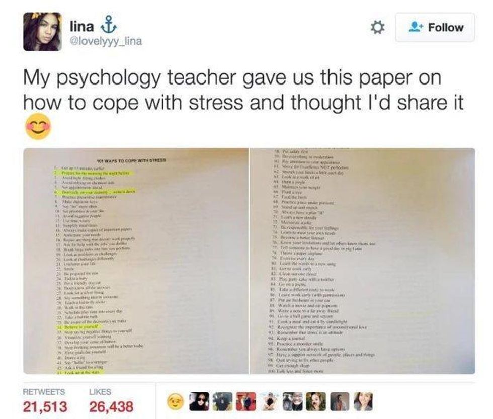After being shared by one of the teacher’s students on Twitter. It was full of quick fixes for moments of stress, like "smiling" and "hugging a dog". But it also contains more long-term coping mechanisms to eliminate stress occurring in the first place. These include "always make copies of important papers" and "don't rely on your memory... write it down".