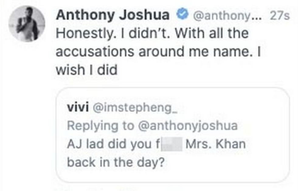 Khan jumped the gun and accused his wife of getting with fellow boxer Anthony Joshua. After a string of tweets, it turned out the screenshots he was sent were completely fake, leaving Khan "embarrassed" by the whole ordeal.