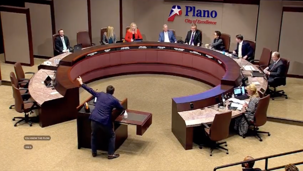 The eight members of Plano's city council watched as Stein gyrated his hips and jumped around pretending to hype-up a non-existent crowd.