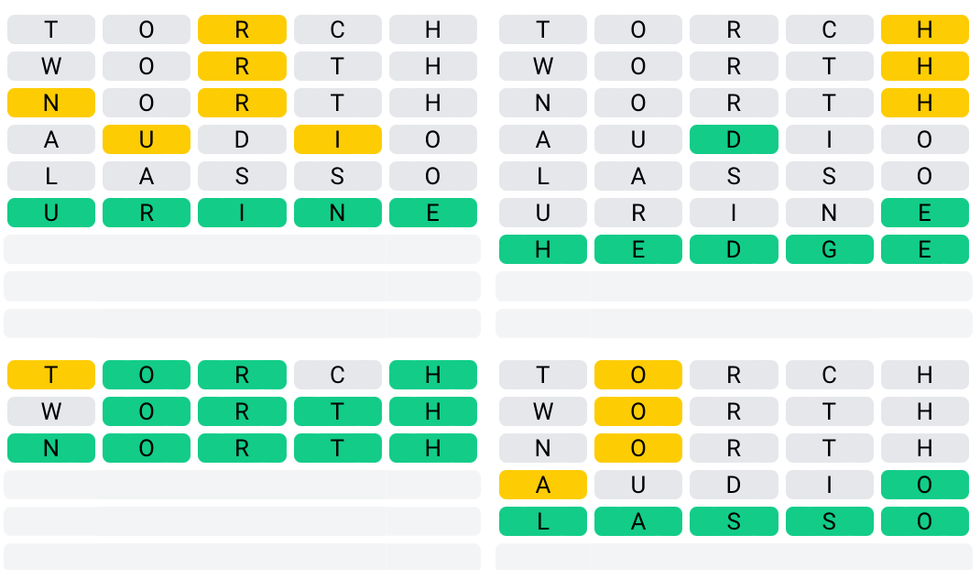 You have nine chances to guess all four words. Each attempt populates all four grids.