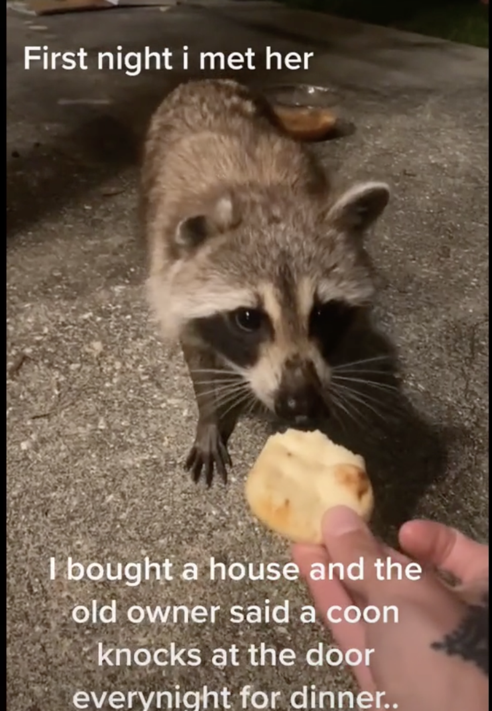 Within the video, you’ll see a raccoon on a cement ground outside in the night. The raccoon comes up to Brittanyrose and takes what appears to be a chip from her, and hurries off. The caption written across the screen reads “First night i met her. I bought a house and the old owner said a coon knocks at the door every night for dinner.”