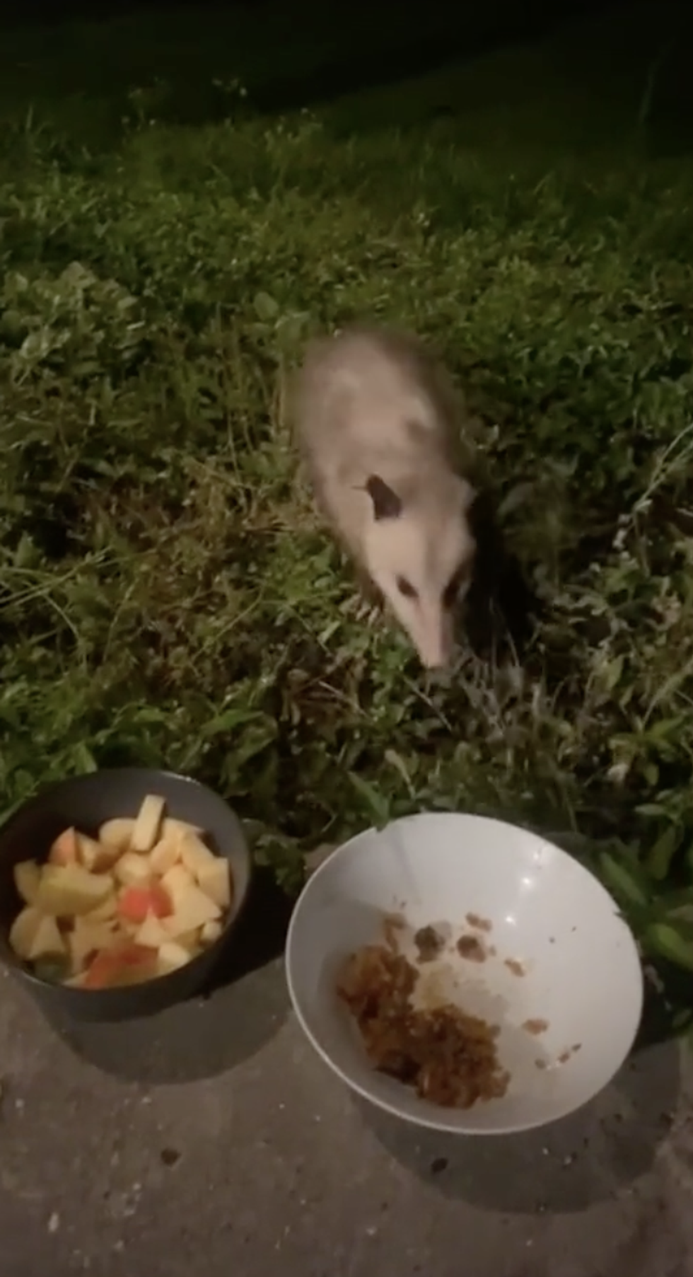 In a second video, she shows a bowl of what appears to be cut-up apples in one bowl and rice in the other as an opossum coming up to eat it. Then in the distance, you see another raccoon standing up on its hind legs trying to see what’s going.