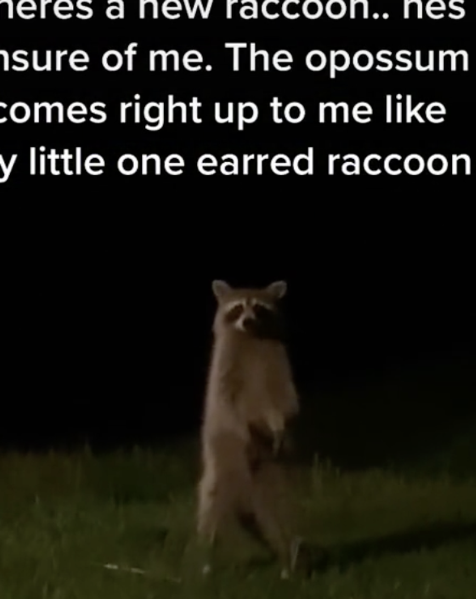 In the next scene, Brittanyrose filmed the raccoon standing up, watching her from her door in the daytime. She also states that she didn’t believe the owner at first but continued to put food out every night.