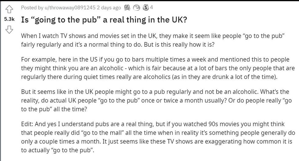 They continued: “When I watch TV shows and movies set in the UK, they make it seem like people ‘go to the pub’ fairly regularly and it’s a normal thing to do. But is this really how it is?