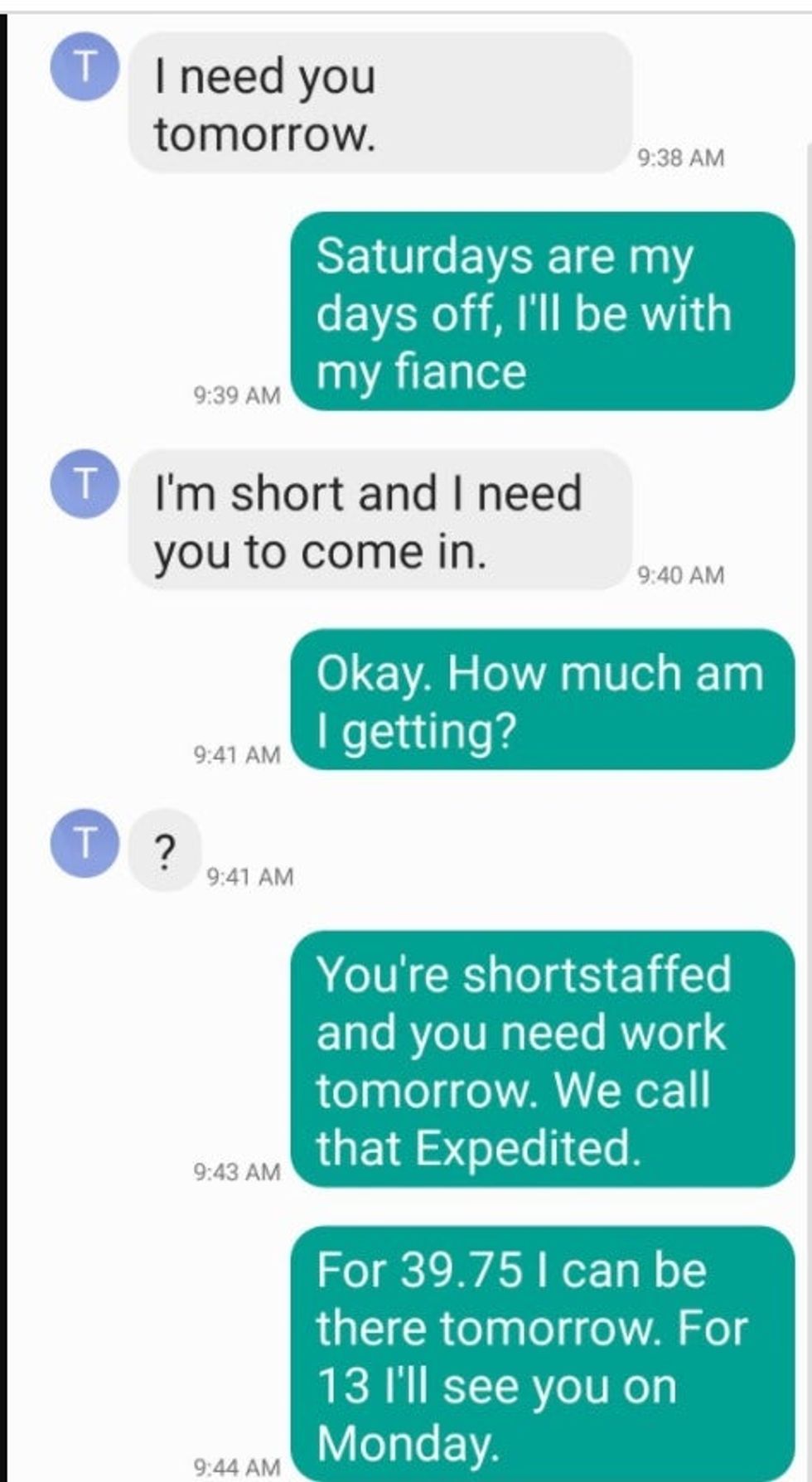 One person said they tried to haggle with their boss about their salary when they were asked to come in last minute: