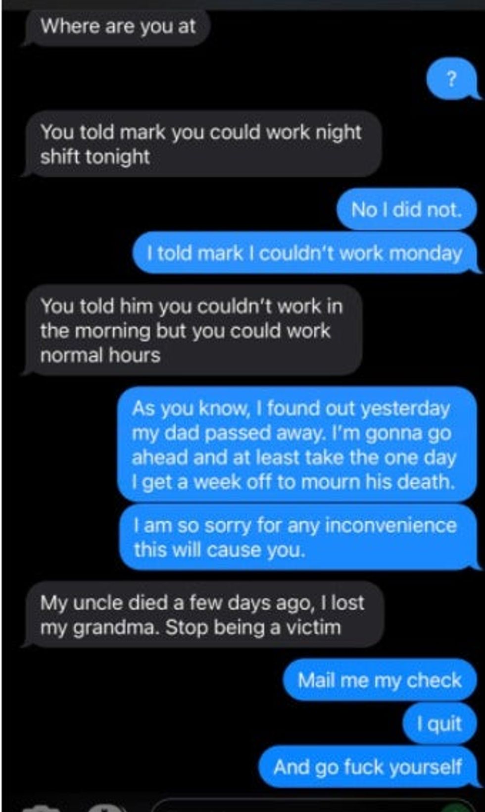 Another quit when their boss called them a “victim” when they requested time off following the death of their father.