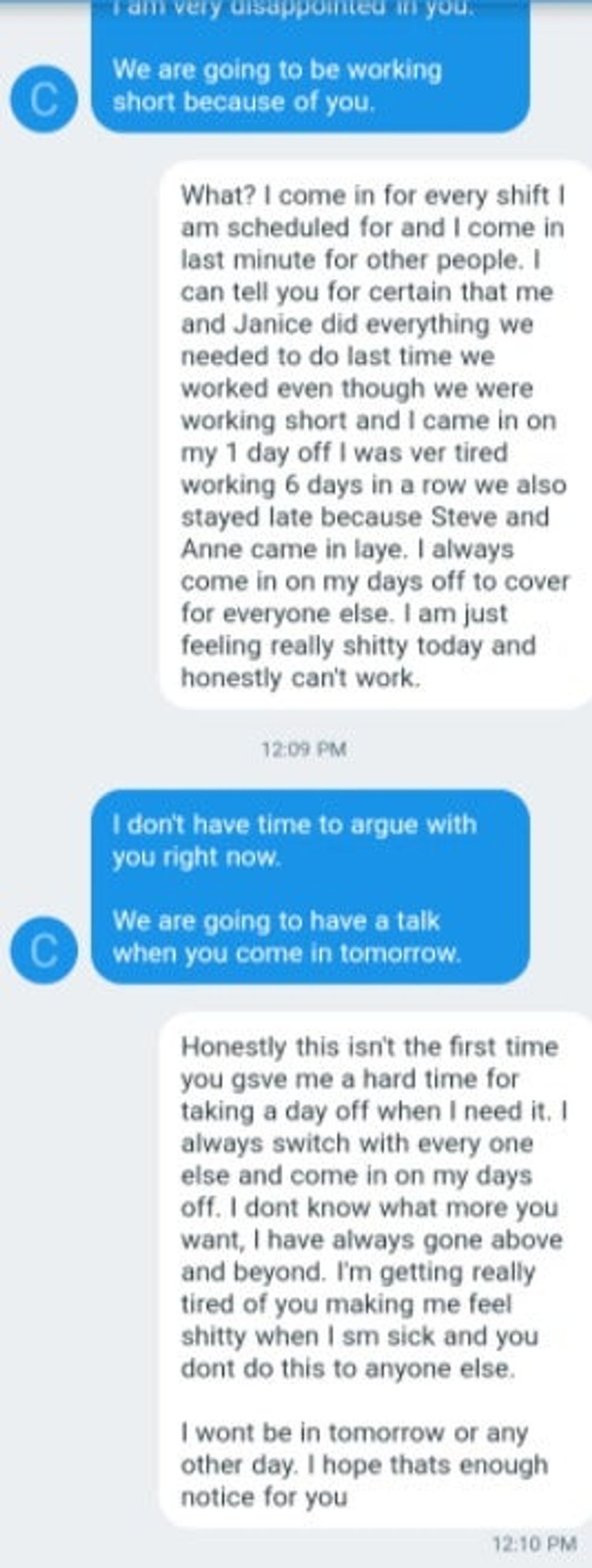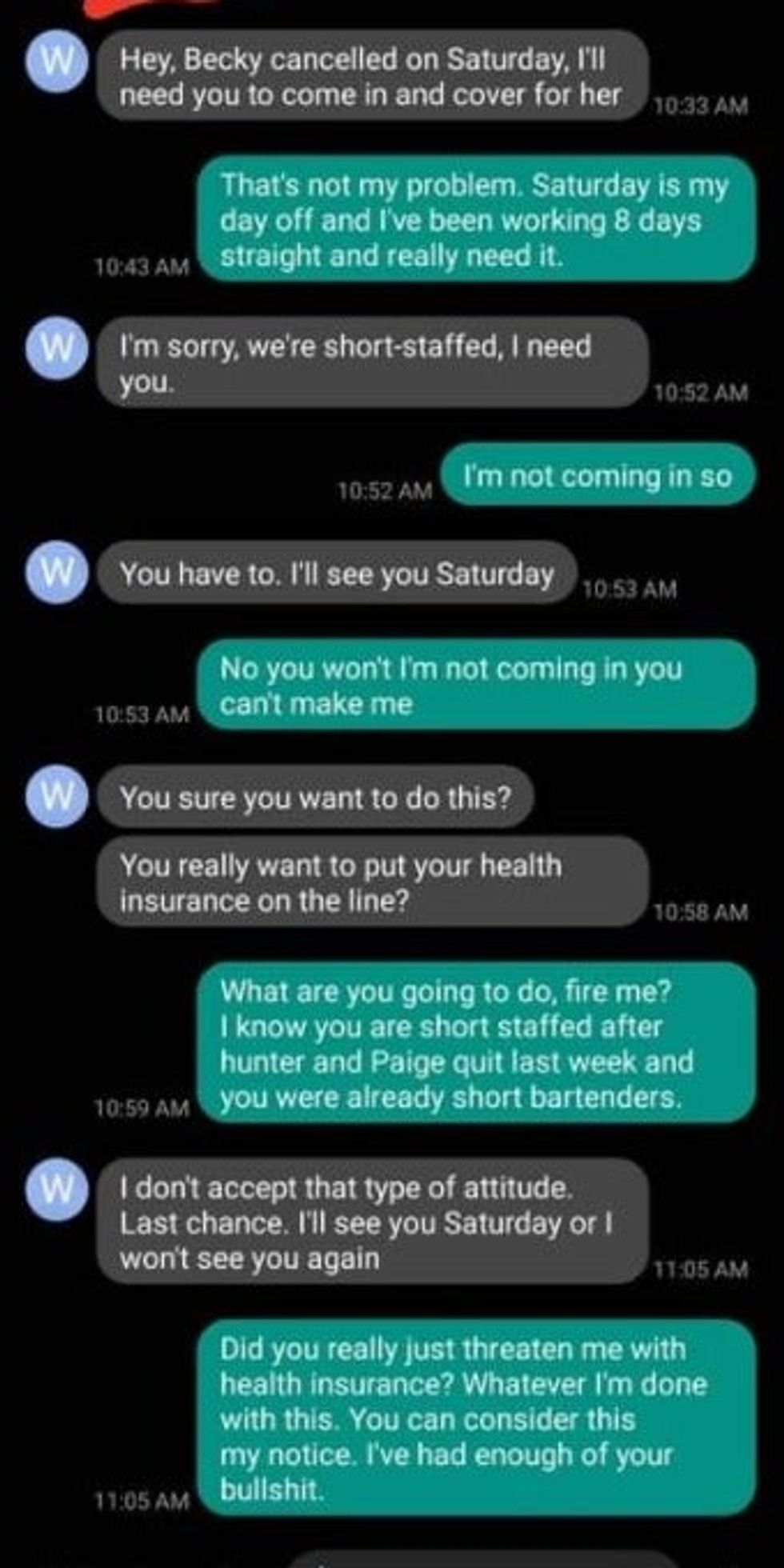 And a fourth said they quit because their boss “threatened” to remove her health insurance benefits if she didn’t come in last minute to cover someone else’s shift.