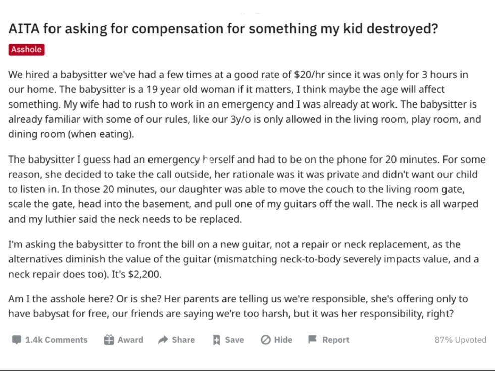 “So OP ruined his own guitar and is trying to fleece the babysitter for the cost? Yikes,” a reader responded.