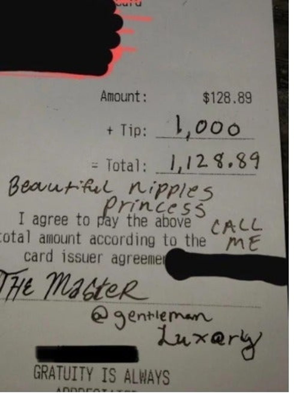 A customer has given the internet the absolute creeps by apparently leaving an inappropriate note for a waitress alongside a ridiculous tip.