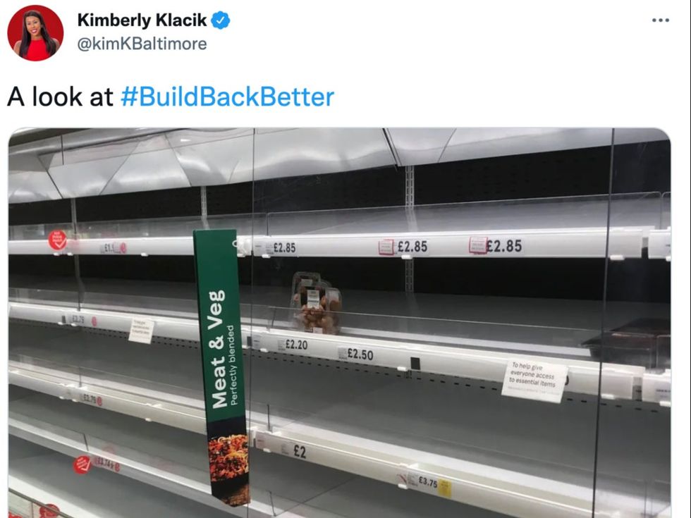 She tweeted, “A look at #BuildBackBetter”, along with an image of empty grocery shelves. The issue? The shelves in question belonged to the British supermarket chain, Tesco.