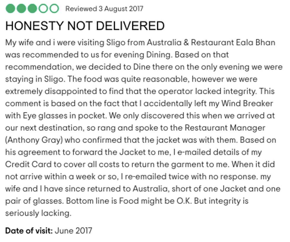Graham, an Australian tourist, left a bad review on Trip Advisor of the restaurant Eala Bhan in Sligo, Ireland. He said that he and his wife were “extremely disappointed” at the owner’s alleged lack of integrity.
