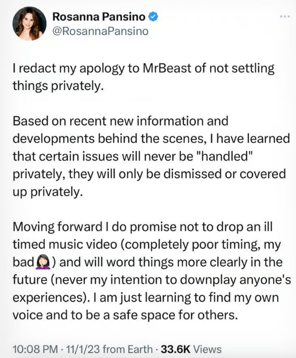 The drama surrounding Rosanna Pansino and MrBeast has taken another turn after Pansino appeared to redact her previous apology, before deleting it.
