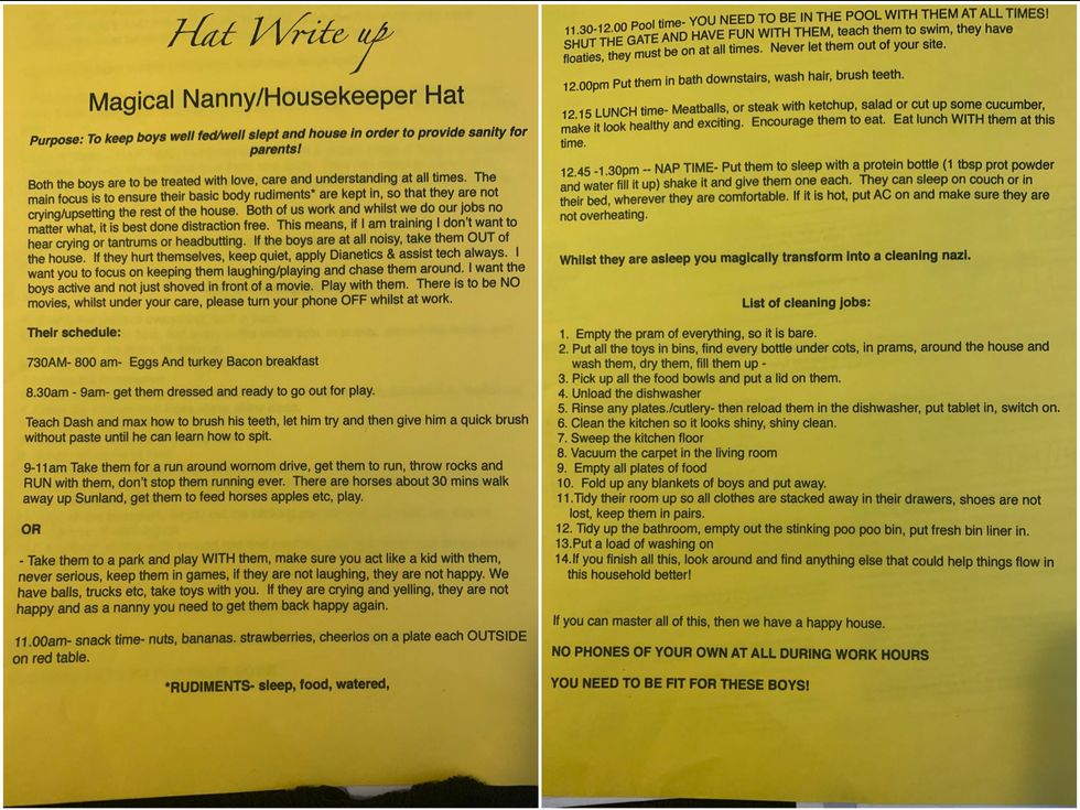 The description continued by setting out a precise schedule for the day, starting with a breakfast of eggs and turkey bacon. The nanny was then expected to teach the boys “how to brush [their] teeth.”