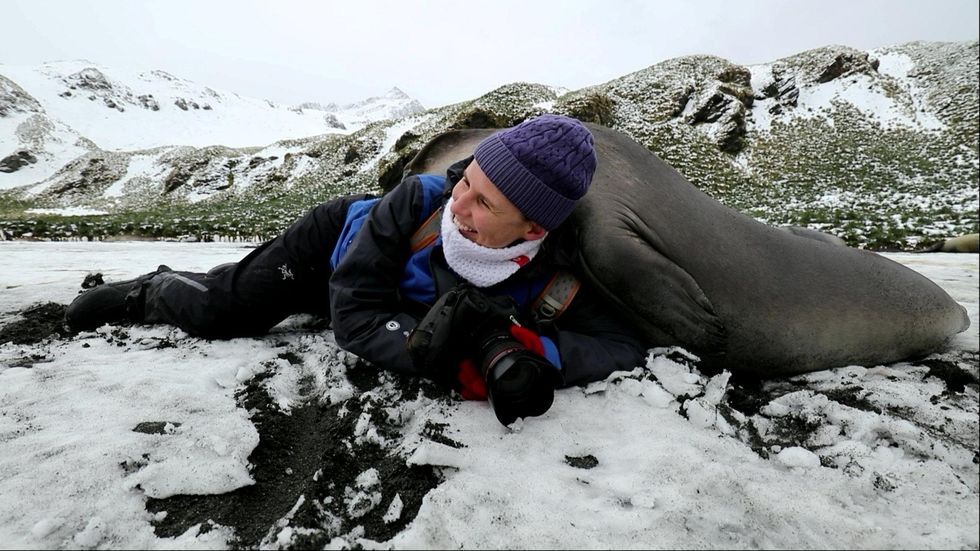 Chris, a geographic wildlife photographer from Christmas Island, Australia, said: “My wife Jess was lying down to take a shot of some king penguins in South Georgia when a marauding gang of elephant seal pups decided to flop on over and give her a hug.
