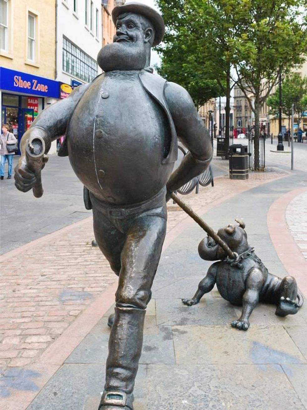 An eight-foot bronze replica of the cartoon character, who appeared in The Dandy from the 1930s, can be found striding down Dundee High Street with his pooch Dawg.