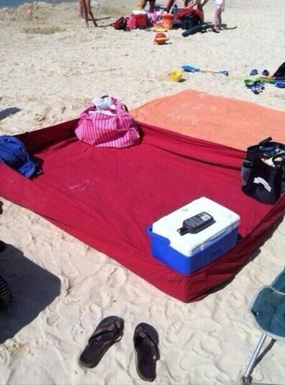Stop sand, which is coarse, rough, irritating and gets everywhere, getting, well everywhere, by using a fitted sheet surrounded by everyday beach things.