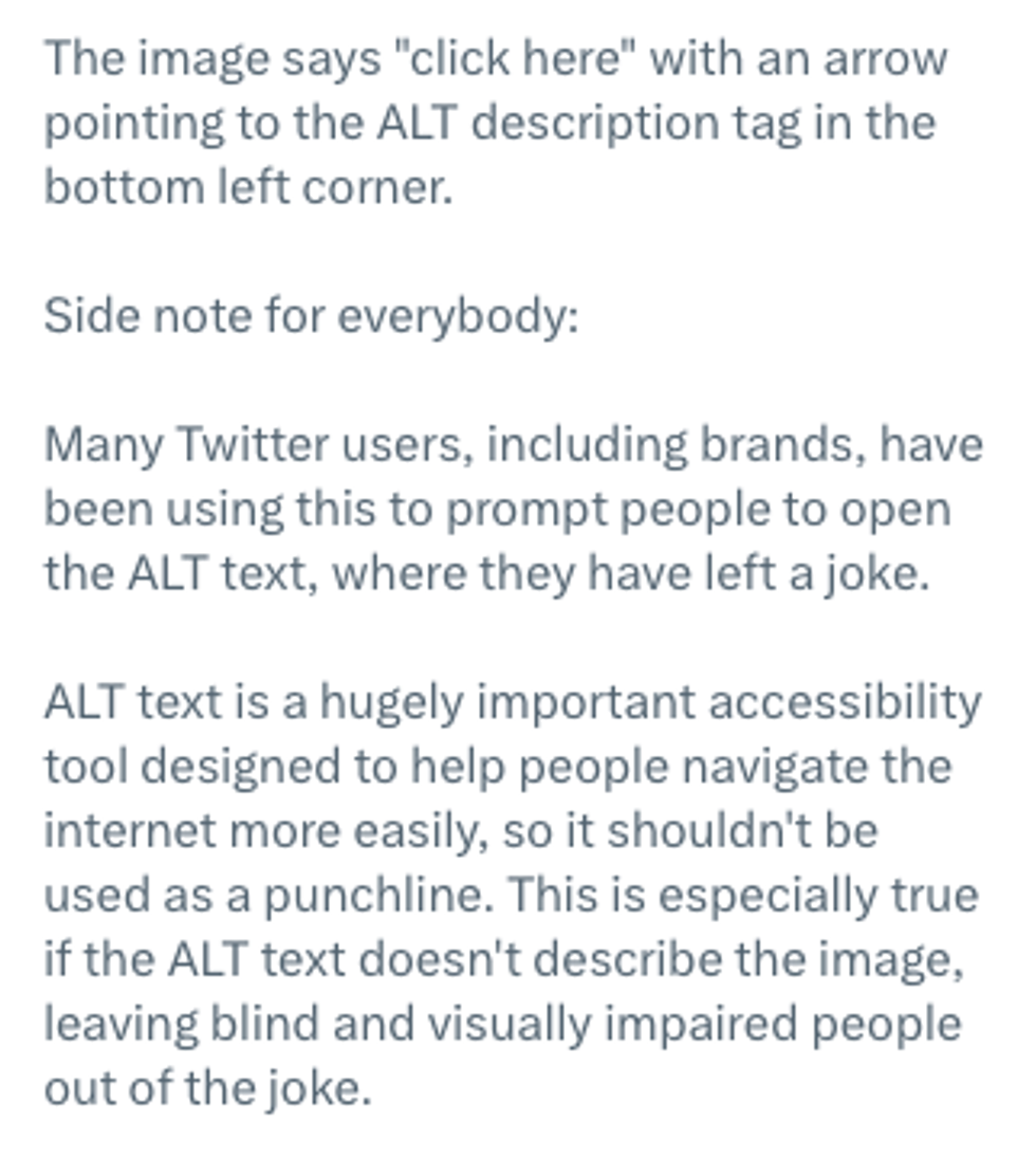 “ALT text is a hugely important accessibility tool designed to help people navigate the internet more easily, so it shouldn't be used as a punchline. This is especially true if the ALT text doesn't describe the image, leaving blind and visually impaired people out of the joke.”