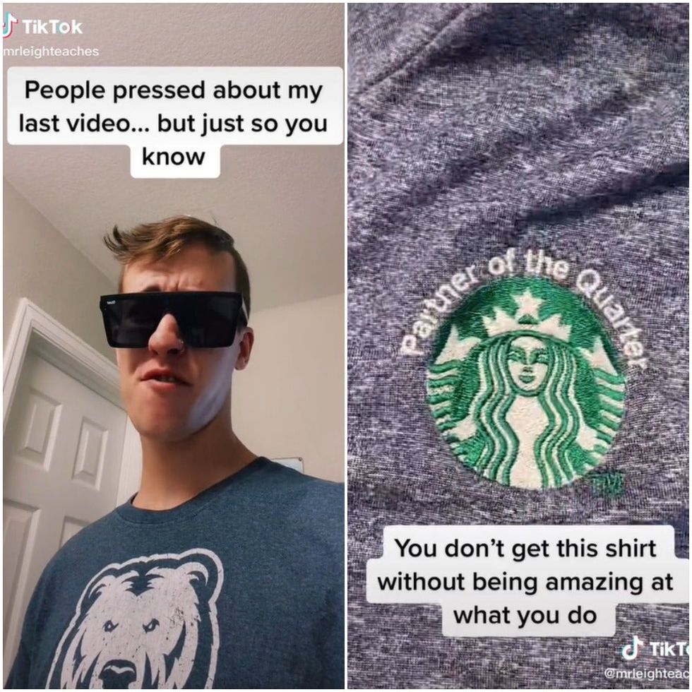 He then shows off his Starbucks shirt that says “Partner of the Quarter” and writes: “You don’t get this shirt without being amazing at what you do.” You can watch the video in full here.