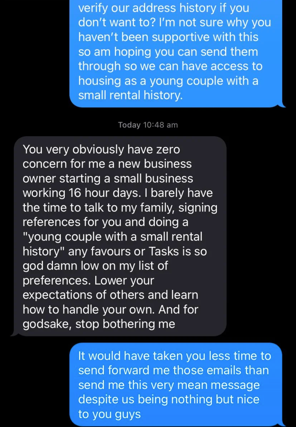 "I barely have time to talk to be family, signing references for you and doing a 'young couple with a small rental history' any favours or tasks is so God damn low on my list of preferences," he added before telling her to leave him alone.