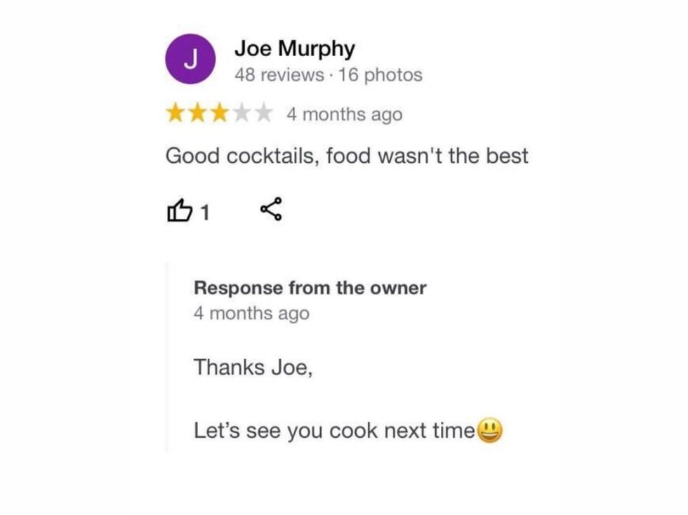 Indeed, some restaurants simply won’t swallow the criticism, and so they hit back at their critics with searing replies.
