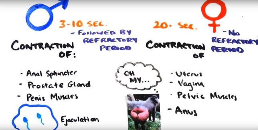Women on the other hand, have "rhythmic contractions" of the uterus, vagina, anus and pelvic muscles.