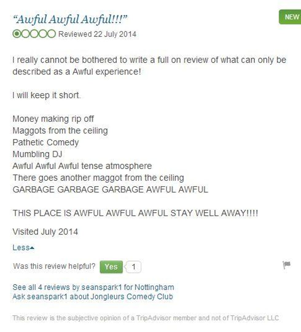 Another TripAdvisor reviewer who visited earlier this month explained his experience thus: "I'd have had a more amusing night if I'd spent £1 on some cheap Christmas crackers and sat in a cold bath reading the free jokes, whilst my partner poked me in the arm with a sharpened pencil as she endlessly shouted 'you're not in the home of comedy...'"