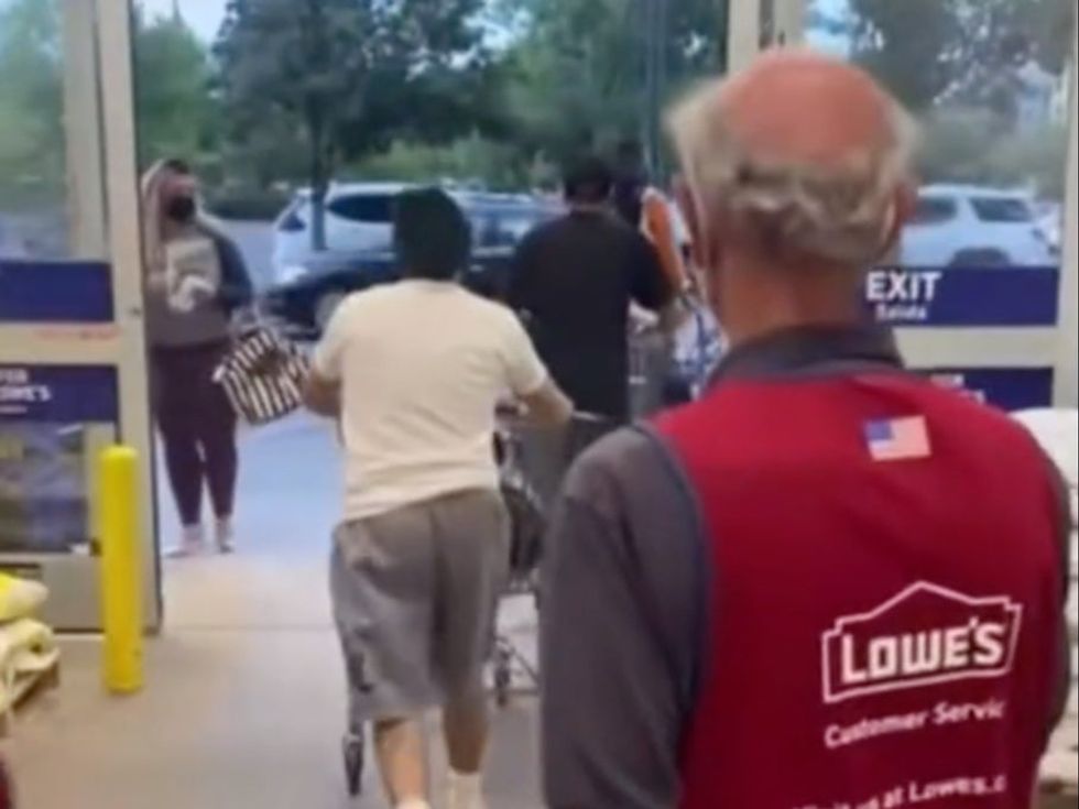 The footage shows a Lowe’s staff member approach the men as they walk towards the store’s exit. The employee is heard asking for their receipt, to which he responds, “right there” before flinging his arm to the left.