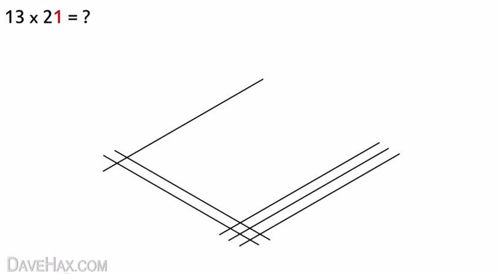 For example, 13 x 21. The first digit is one, which means you start by drawing a straight line diagonally.