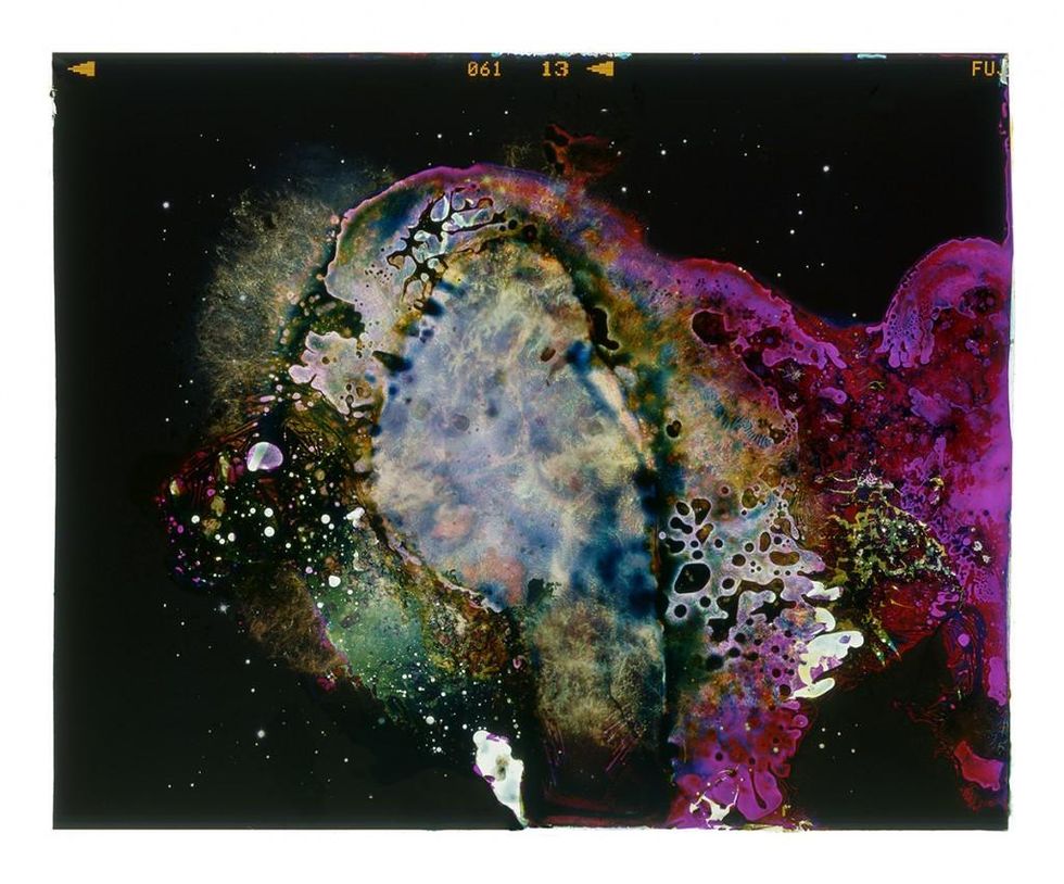 To create the images in Cosmos, DeSieno grew bacteria on pieces of coated film of images of outer space. The germs stripped away layers on the film creating these intensely colourful, haunting images.