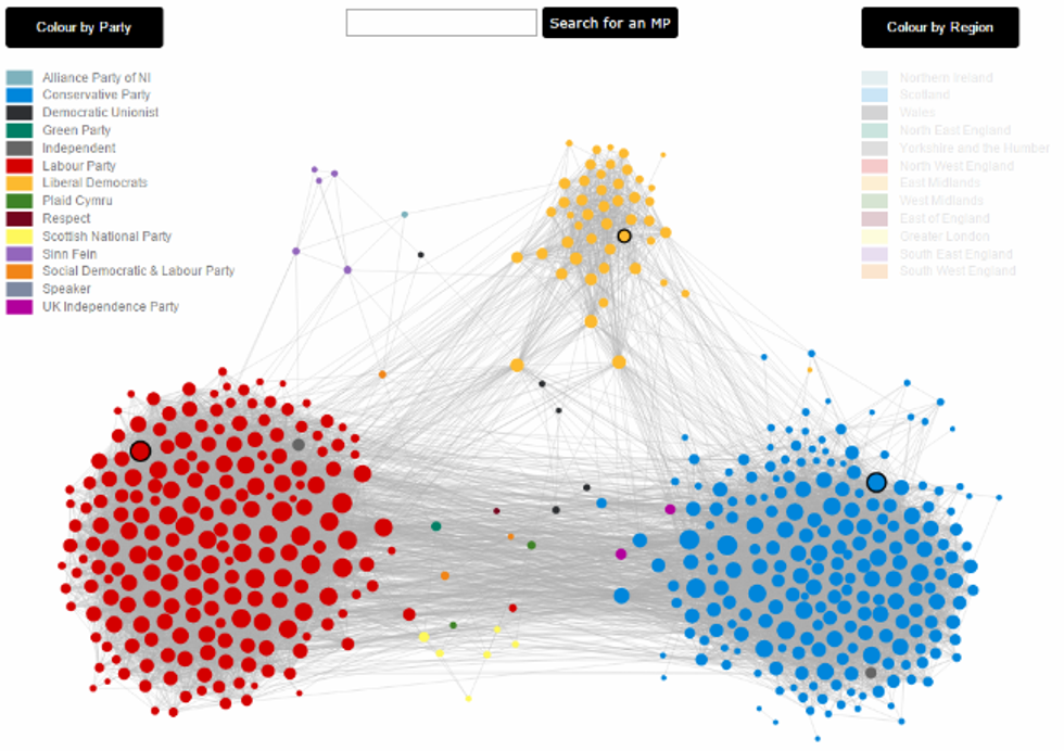 Each MP is represented by a node and the colour indicates their party. The nodes are connected if both MPs follow each other on Twitter. Larger nodes correspond to more connections.