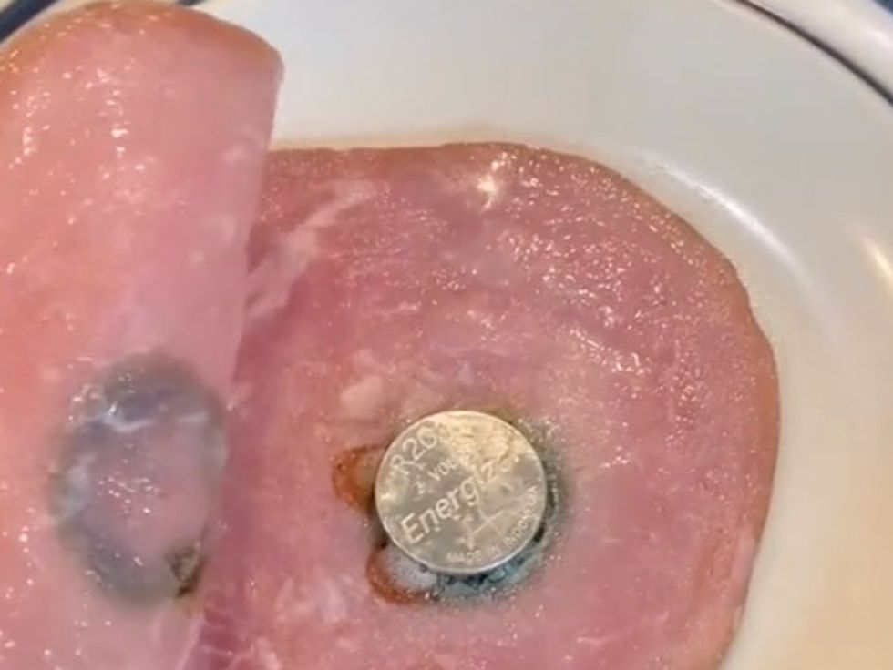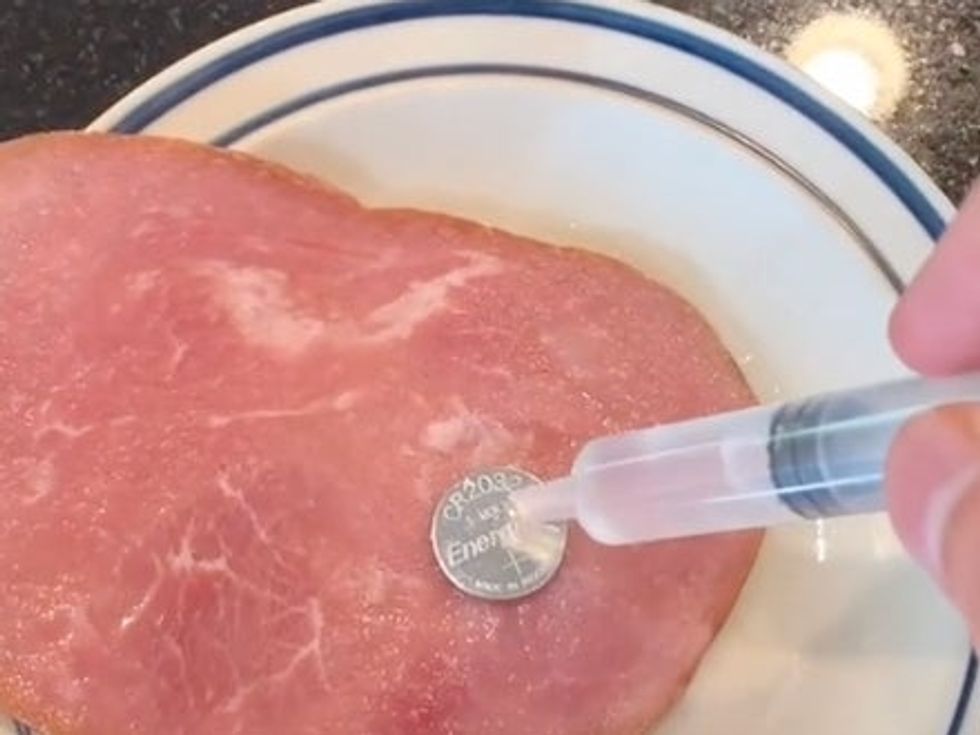 At the beginning of the video, titled (appropriately) “Why You Shouldn’t Swallow a Battery!”, Dr Youn place a tiny battery coin on a slice of ham and then pours water on top.