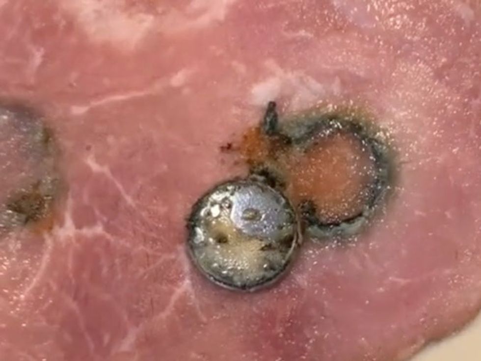 Once it reached the three-hour mark, Dr Youn shows that the battery acid has almost bore a hole through the ham.