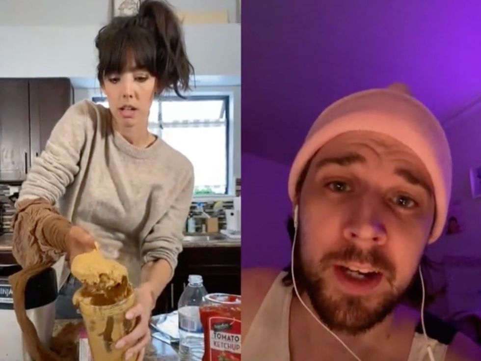 He continues: “Don’t pay attention to anything she’s squirting in there right now,” as the woman – TikToker Cariebell – dollops ketchup and mustard on top of the water-logged bun.