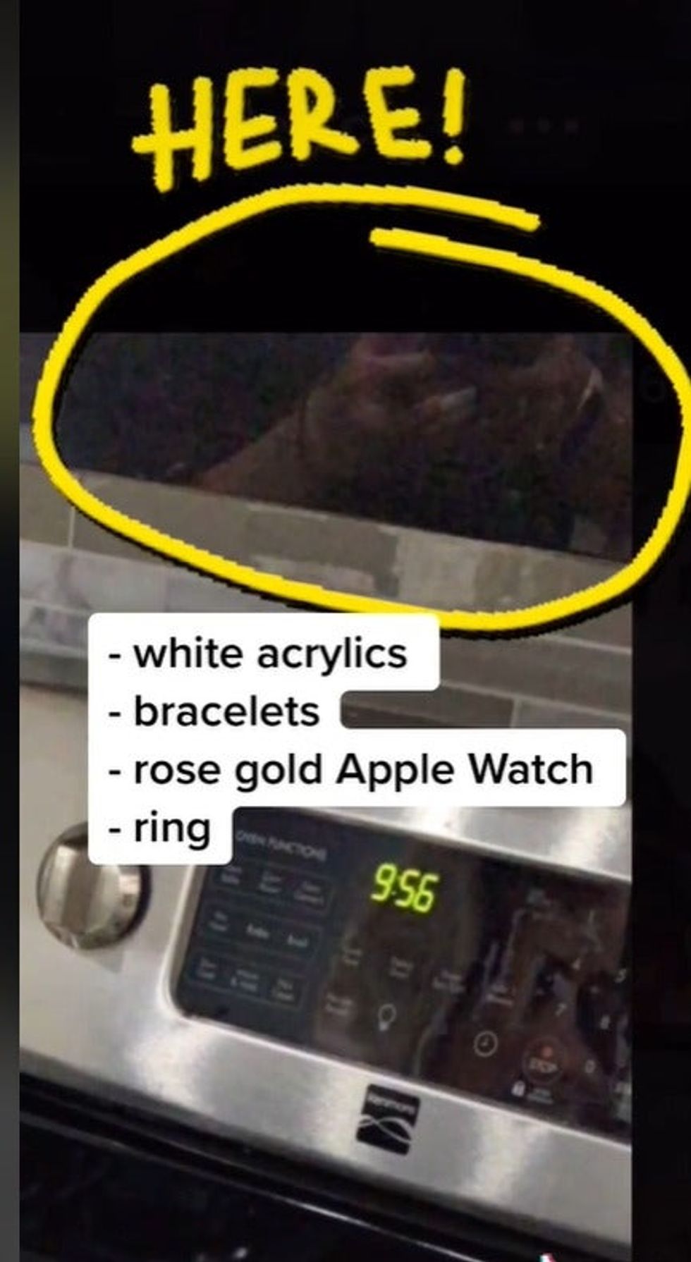 But upon zooming in, she noticed a reflection the metal stove that appears to show a woman holding a phone wearing acrylic nails.