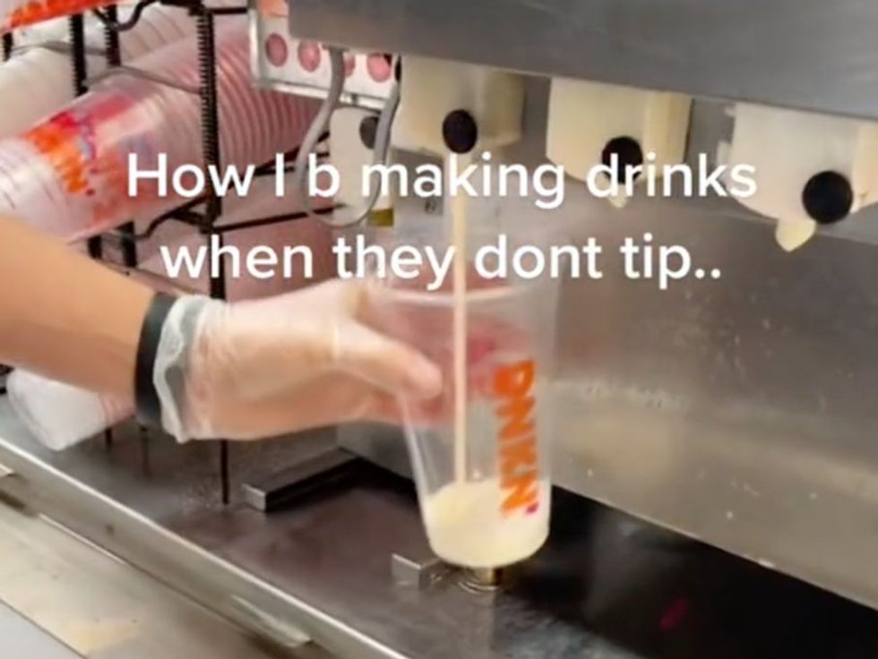The video shows the alleged Dunkin’ employee making what appears to be an iced coffee. For those who ‘don’t tip’, he pours the cream, sugar, ice, and coffee in a cup and ‘mixes’ them together by swirling the cup around.