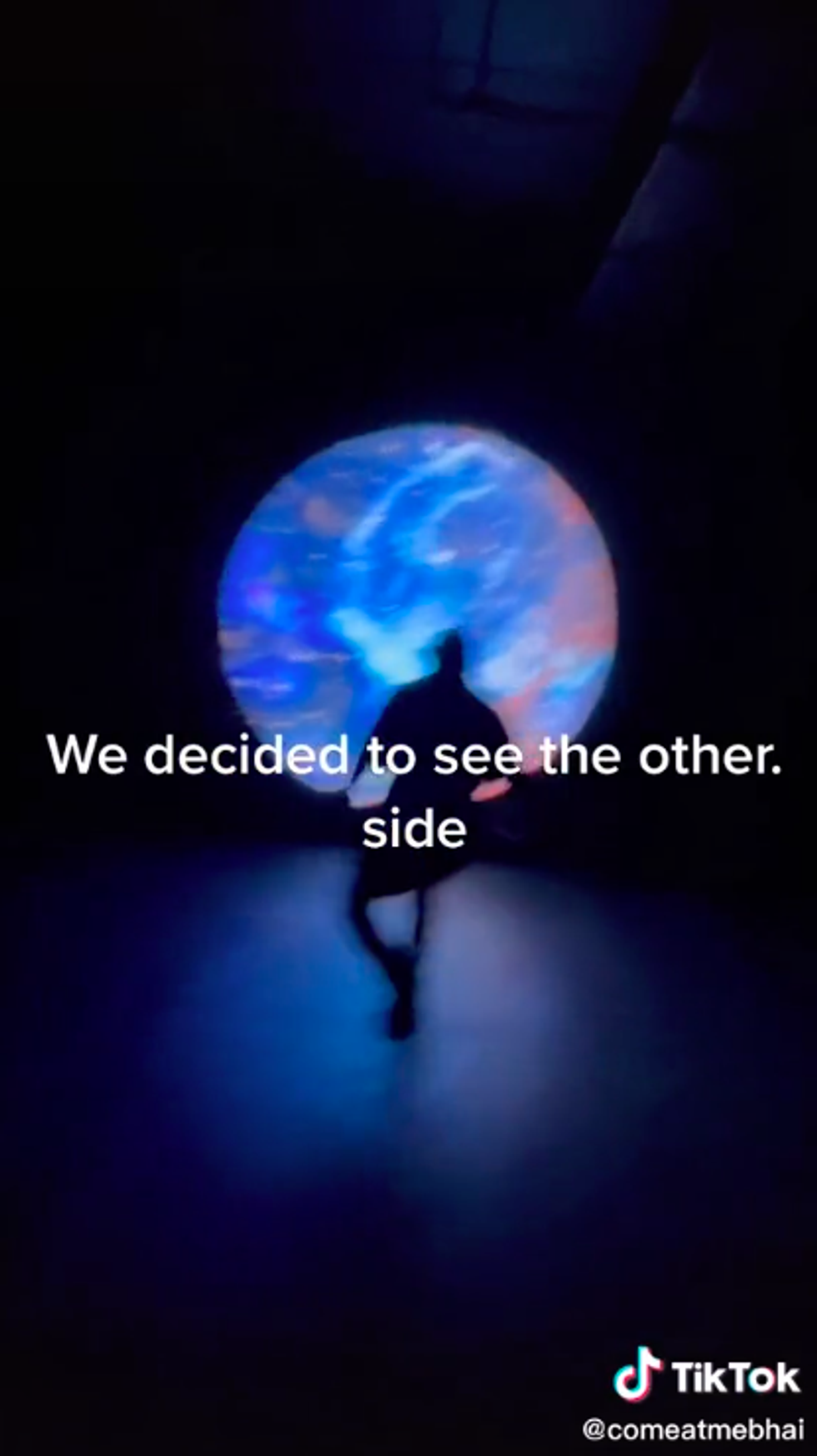 The video then cuts to the man staring at what looks like a projection of an animation that you might see at your local science museum. The video ends with the man jumping at the ‘portal’ to ‘see the other side’.