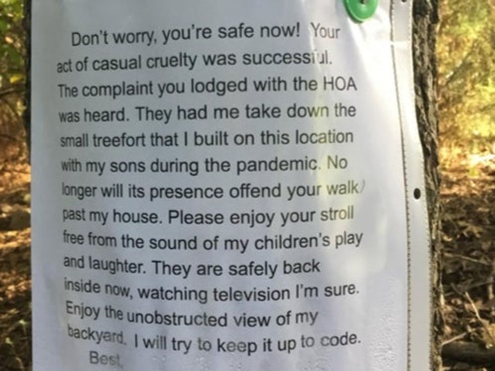“No longer will its presence offend your walk past my house,” the sign continues, referring to the treehouse. “Please enjoy your stroll free from the sound of my children’s play and laughter. They are safely back inside now, watching television I’m sure.”