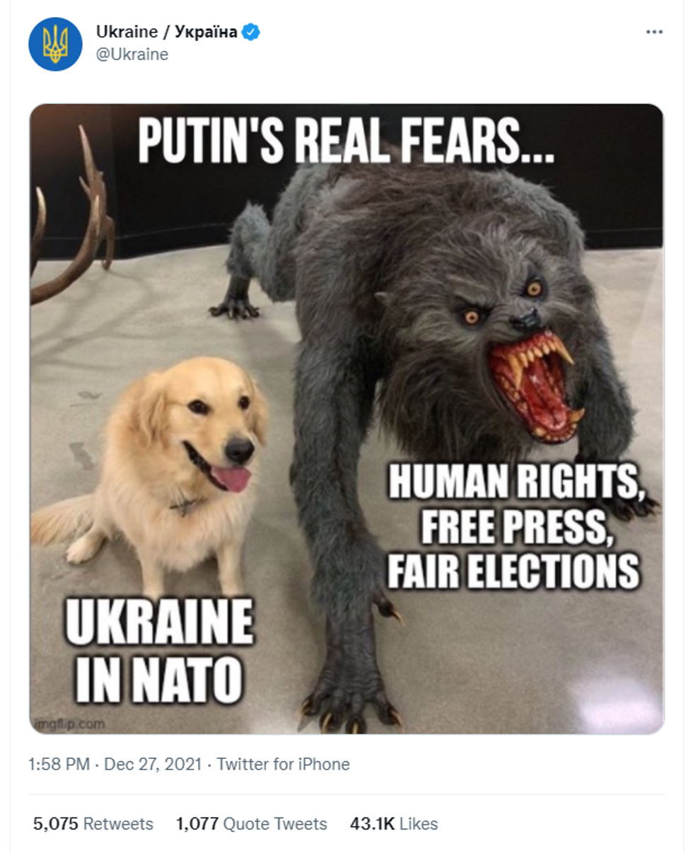 While the account posts tweets you might expect from a country's official feed like anniversaries of historical events, photos of places in the country, every so often they slap memes down mocking Russian president Vladimir Putin, making light of tensions between the two countries, and denouncing "appeasement" strategies.