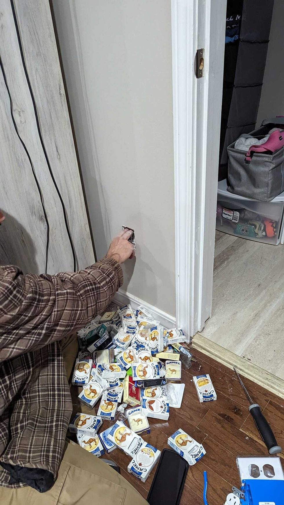 Kristen added: “The cigarette packs we learned aren't from the 1950s which is why we know this wall was built onto the house. We didn't count the number of boxes but as you can see it filled up one whole trash bag. It was one small area of framework so no telling what else might be between other framings of this interior wall.”
