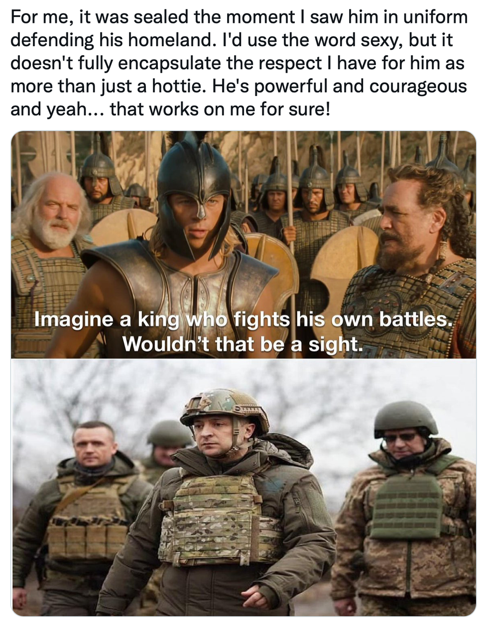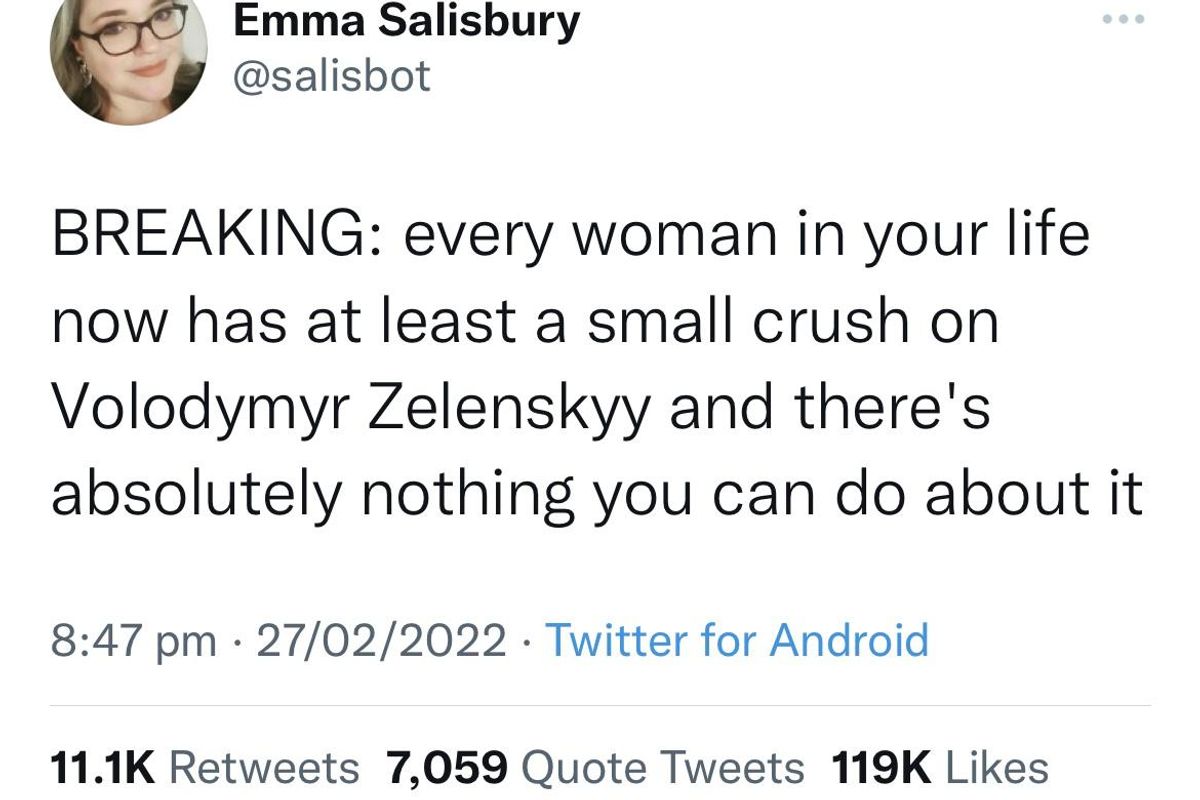 A tweet gained instant traction over the weekend with tens of thousands of RTs and over 200,000 likes. It read: "BREAKING: every woman in your life now has at least a small crush on Volodymyr Zelensky, and there's absolutely nothing you can do about it".