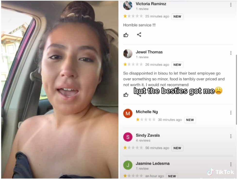 One read: “So disappointed in Bisou to let their best employee go over something so minor. Food is terribly overpriced and not worth it. I would not recommend.”