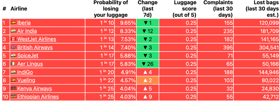At the time of writing, Iberia has taken the top spot with Pieter claiming them to have a one in 10 chance of losing luggage. This is followed by Air India and WestJet Airlines.